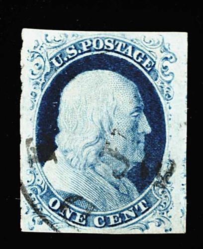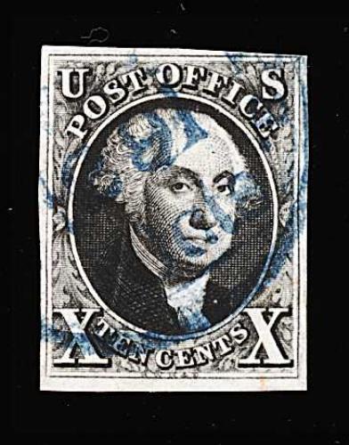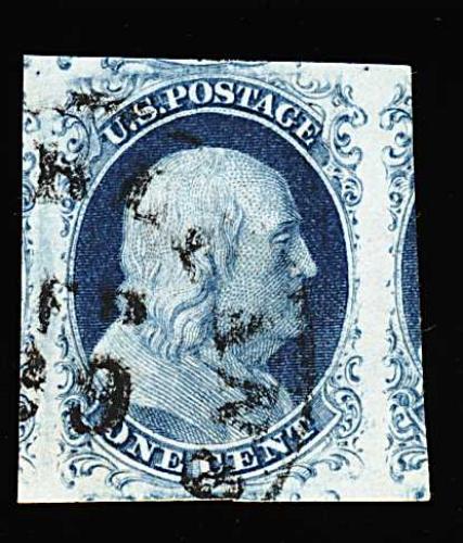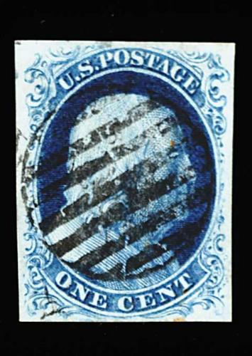 88 O 8A image#8A, 1c Blue, Ty. IIIa, an especially handsome used single, with large and remarkably well balanced margins all around, deep luxuriant color and a highly detailed early impression, socked-on-the-nose grid cancel, extremely fine; a rare stamp in this select quality; 1985 and 1999 PF certificates. (Image) 975.00