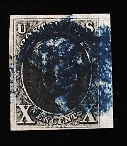 90 O 9 image#9, 1c Blue, Ty. IV, a stunning used single, possessing huge margins which show portions of all four adjoining stamps, strong rich color and a clean impression, light town c.d.s., faint stain on reverse only, an extremely fine and spectacular gem. (Image) 125.00