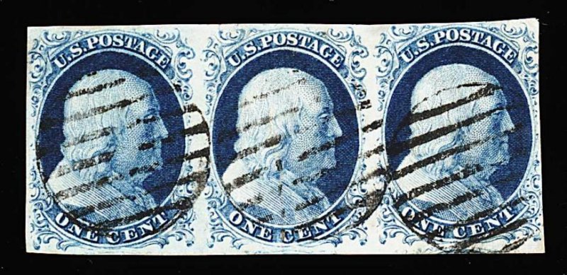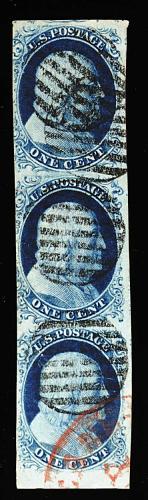 86 O 7 #7, 1c Blue, Ty. II, used vertical strip of of three, pos. 79R1E-99R1E, with sheet-margin at bottom, other margins large except just into design at left, intensely deep color and sharp impressions, petite grid cancels and a red transit postmark at bottom right, middle stamp with a tiny wrinkle, still very fine. (Image) 510.00