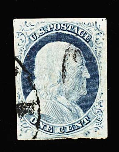 91 O 9 image#9, 1c Blue, Ty. IV, a select used single, with huge margins all around including portions of adjoining stamps on three sides, deep rich color and a crisp detailed impression, unusually light town c.d.s., extremely fine; 1984 PF certificate. (Image) 125.00