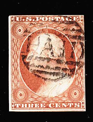 96 O 11 image#11, 3c Dull red, used, full to mostly large margins all around, brilliant color that approaches an orange brown shade, complete blue grid cancel, extremely fine; 1998 PF certificate. (Image) 10.25