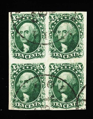 99 Obl 14, 15 image#14, 15, 10c Green, Ty. II and Ty. III, used combination block of four, the top stamps being Ty. II and the bottom stamps are Ty. III, wonderfully fresh, with deep rich color and razor-sharp impressions on clean paper, very large and wonderfully well balanced margins all around, 1857 Columbia, Cal. c.d.s. pmks., a couple trivial flaws, otherwise extremely fine and a most attractive and scarce classic multiple. (Image) 3,500.00