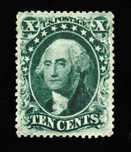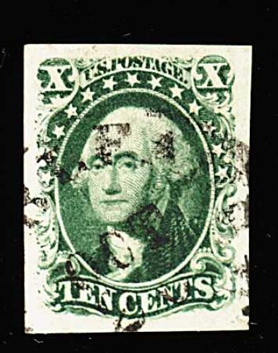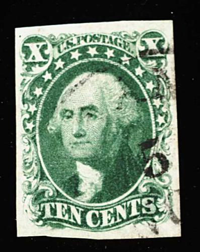 115 og 33 image#33, 10c Green, Ty. III, an enormously rare mint example, possessing mathematically perfect centering amid uncharacteristically large and even margins, strikingly intense rich color and a strong detailed early impression, full clean o.g. which has been lightly hinged, truly superb. The Ten Cent 1857 perforated stamps from Plate 1 are among the most difficult U.S. stamps to find well centered. To find mint examples is even more challenging. And to find a mint example that is both sound and well centered is next to impossible. The example offered here is widely regarded as one of the premier perforated stamps from this plate. And there is little question that this is likely to be the finest mint #32 in existence. A stamp that is missing in even the most advanced collections of mint United States stamps. Accompanied by 1992 and 1994 PF certificates, as well as a 1996 PSE certificate; ex-Morris, Weisman (where it realized $9,900.00 in our May 1998 sale). (Image) 4,500.00