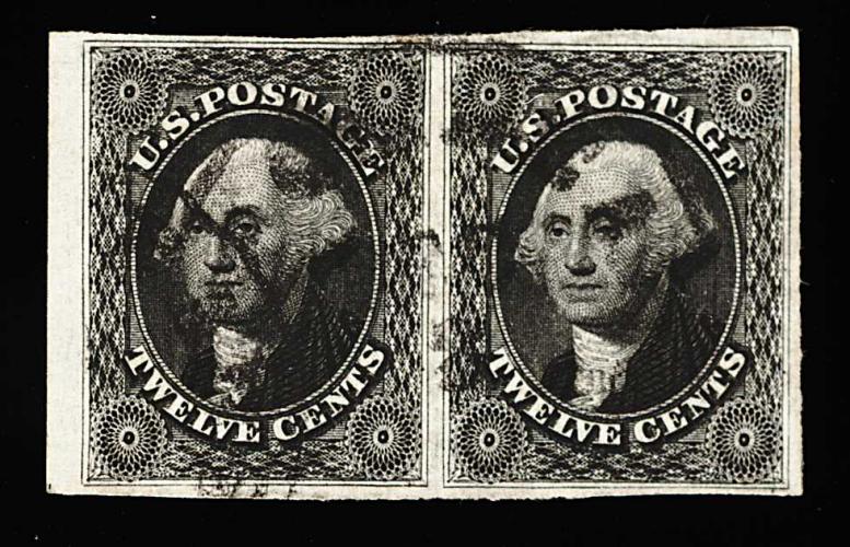 106 O 17 image#17, 12c Black, an exquisite quality used horizontal pair of this difficult classic, being in a condition unlike any other pair we have had the pleasure to offer in our auctions, possessing four large and symmetrical margins which surround an incredibly sharp and detailed impression, plus its color is especially deep and intense, all on bright white paper, beautifully postmarked with a single central strike of a Cincinnati, Ohio town c.d.s. in deep blue, extremely fine in every regard; a gem pair with great eye appeal; 1985 PF certificate. (Image) 705.00