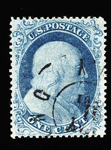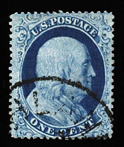 108 O 18 image#18, 1c Blue, Ty. I, an impressive used single, being exceedingly well centered within uncharacteristically wide margins, deep intense color from an early printing, town c.d.s., extremely fine; 1996 PSE certificate. (Image) 550.00