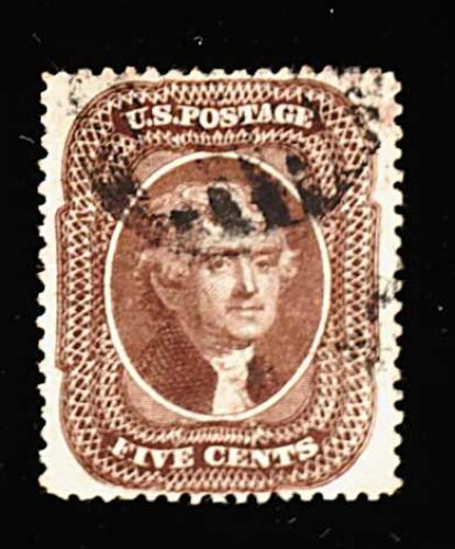 112 O 27 image#27, 5c Brick red, Ty. I, a phenomenal used example of this very scarce stamp, featuring precise centering within margins that are so large as to allow the design to be well clear of the perforations all around (a most unusual occurrence), plus its color is sumptuously rich and its impression razor-sharp, neat 1859 year date c.d.s. postmarks, an extremely fine used gem for the finest collection; 1987 PF certificate. (Image) 1,250.00