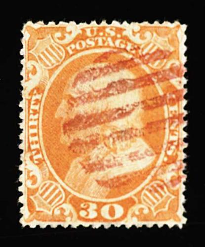 121 O 38 image#38, 30c Orange, a pretty used single that possesses incredibly deep vibrant color and a crisp detailed impression, uncharacteristically well centered, a neatly struck red grid cancel further contributes to the stamp's impressive qualities, extremely fine; 1999 PF certificate. (Image) 490.00