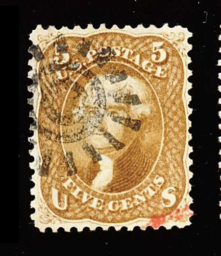 132 O 67a image#67a, 5c Brown yellow, a most attractive used single, exceptionally well centered within very large margins for this, bright and unmistakable brown yellow color, unusual dots in grid cancel, extremely fine; 1995 PF certificate as a #67. (Image) 750.00
