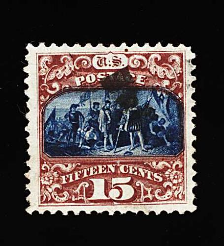 155 O 119 image#119, 15c Brown and blue, Ty. II, a most impressive used single that is wonderfully well centered within enormously large margins, strong colors, light cork cancel which is mostly free of the central vignette, extremely fine; seldom seen with margins this large; 1993 PF certificate. (Image) 250.00