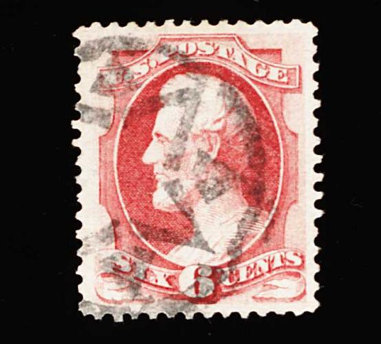 167 O 137 image#137, 6c Carmine with grill, an extraordinarily choice used single, possessing near perfect centering within uncharacteristically large and wonderfully well balanced margins, plus it color is uncommonly rich and luxuriant, a fancy geometric NYFM cancel further contributes to the stamp's desirability, extremely fine; used examples this choice are seldom seen; 2000 PF certificate. (Image) 500.00