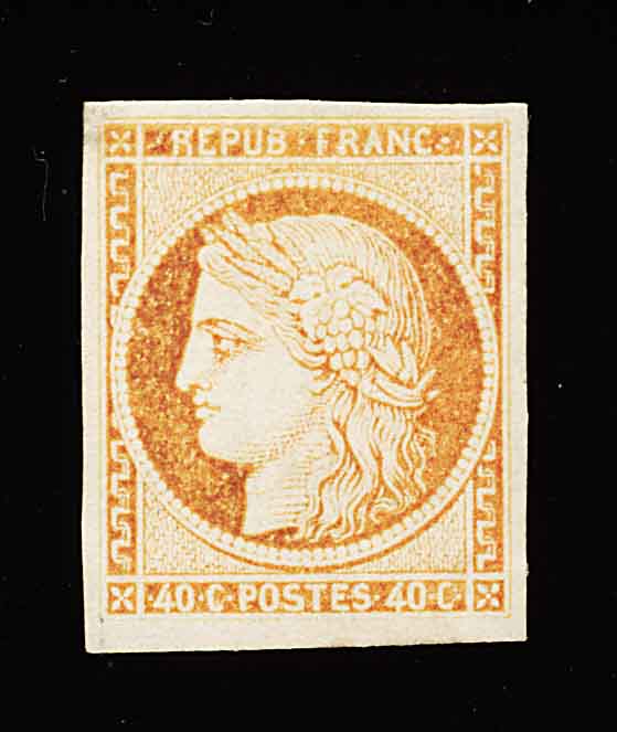 4 og 14a image#14a, 1871 40c Orange on yellowish, Ty. II, large margins all around, strong color and impression, full o.g., tiny thin spot in the top left margin only, otherwise an extremely fine example of this very scarce stamp (Yvert #13b; FF 24,000). (Image) 2,400.00