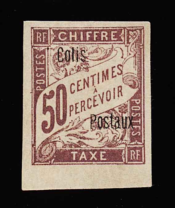 110 og Q3 image#Q3, 1903 50c lilac, with "Colis/Postaux" ovpt., large margins all around including a sizable sheet margin at bottom, rich color, o.g., minor h.r., trivial natural gum crease mentioned only for accuracy, extremely fine; a very rare stamp, especially in this choice quality; signed Calves and others (Yvert #CP4A; FF 25,000). (Image) 2,500.00
