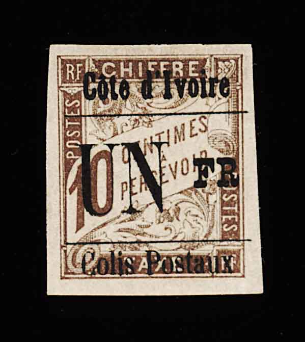 111 og Q4 image#Q4, 1903 1Fr Rose on buff, with "Colis/Postaux" ovpt., large margins all around, strong color, o.g., tiny thin spot and a minute pinhole in the top margin, very fine appearance; very rare and seldom offered; signed A. Brun (Yvert #CP4B; FF 25,000). (Image) 2,500.00