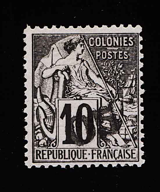 112 og Q14 image#Q14, 1903 "fr 1 fr" Surcharge on 5c Blue, Ty. IV ovpt., a highly desirable mint example of this great rarity, mostly large margins all around, strong color, full original gum, very fine; a stamp that is missing from even the most advanced collections of French Colonies; signed A. Brun, Miro and accompanied by a 1996 Behr certificate (Yvert #CP7c; FF 82,500). (Image) 6,750.00