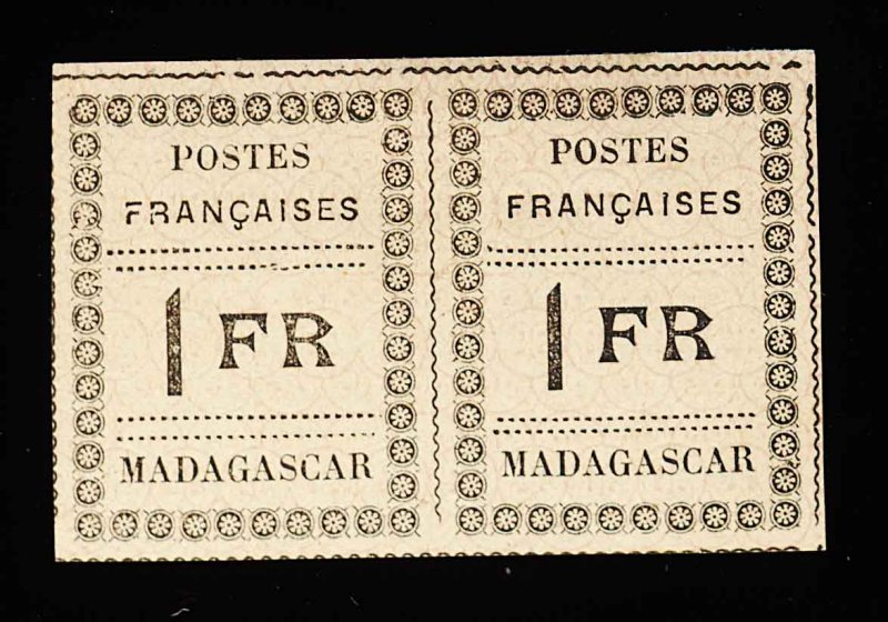 120 og 12 image#12, 1891 1Fr Black on yellow, horizontal pair, without gum as issued, frame lines complete, strong fresh color and paper, completely sound without the usual thins and creases that plague this issue, very fine; a very scarce multiple; 2000 Behr certificate (Yvert #12; FF 18,000+). (Image) 2,000.00+