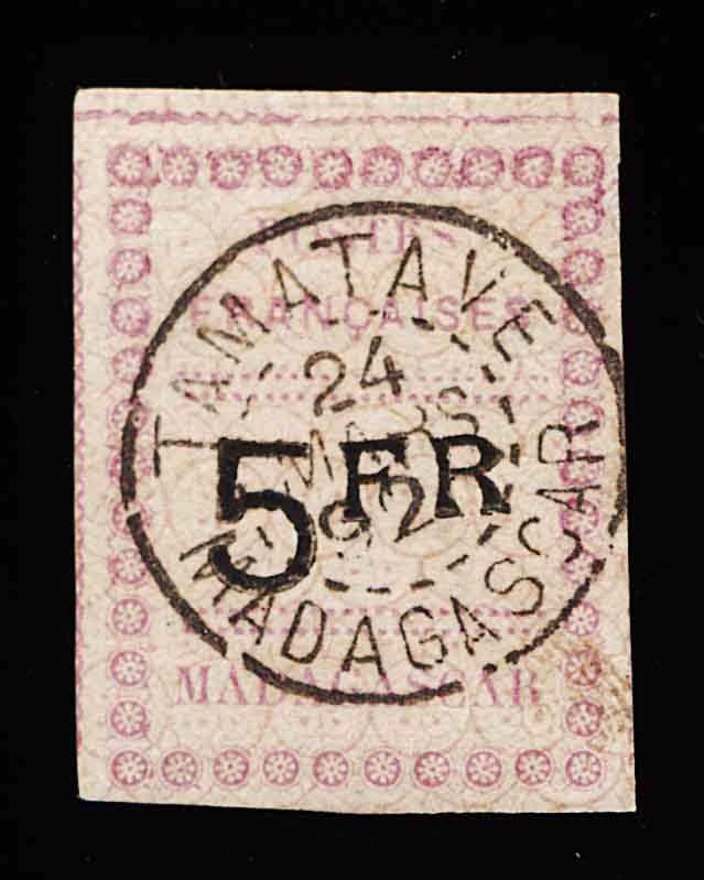 122 O 13 image#13, 1891 5Fr Violet and black on lilac, an attractive and completely sound used example of this stamp, with large margins all around, strong color, neat centrally struck Tamatave, March 24, 1892 c.d.s., very fine; most used examples of this stamp are faulty, and to find a sound copy such as this is very rare; signed A. Brun and accompanied by a 2000 Behr certificate (Yvert #13; FF 9,000). (Image) 1,100.00