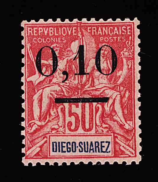 133 og 62 image#62, 1902 "0,10" Wide surcharge on 50c Carmine on rose, a brilliantly fresh mint example of one of the rarest French Colonies stamps from the early 20th century, deep vibrant color, well centered, full o.g., h.r., very fine; only 75 were printed; signed Calves (Yvert #60II; FF 35,000). (Image) 4,750.00