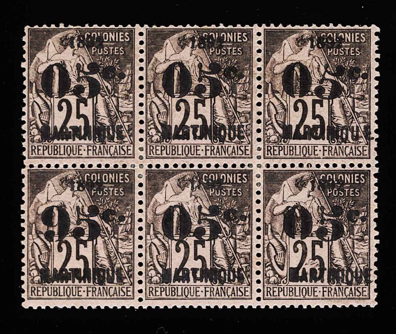 138 ogbl 31b, 31c image#31b, 31c, 1892 "95c" Surcharge error on 25c Black on rose, and "05c" Surcharge with slanting "5", the two varieties contained in a block of six, the bottom left stamp being the "95c" error and the top right stamp being the slanting "5" variety, nicely centered, fresh color, o.g., a very fine showpiece (Yvert #29a, 29b; FF 8,170+). (Image) 610.00+