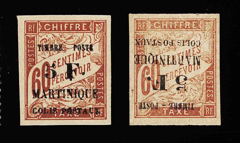 139 og Q1, Q1a image#Q1, Q1a, 1903 "5 Fr." Surcharge on 60c Brown on buff postage due, normal and inverted overprints, both with large margins all around, normal ovpt. with full o.g. and a tiny thin speck, inverted ovpt. with part o.g. and a tiny pinhole caused by the overprinting, very fine appearance; #Q1 signed Calves, #Q1a signed A. Brun (Yvert #60, 60a; FF 8,800). (Image) 825.00