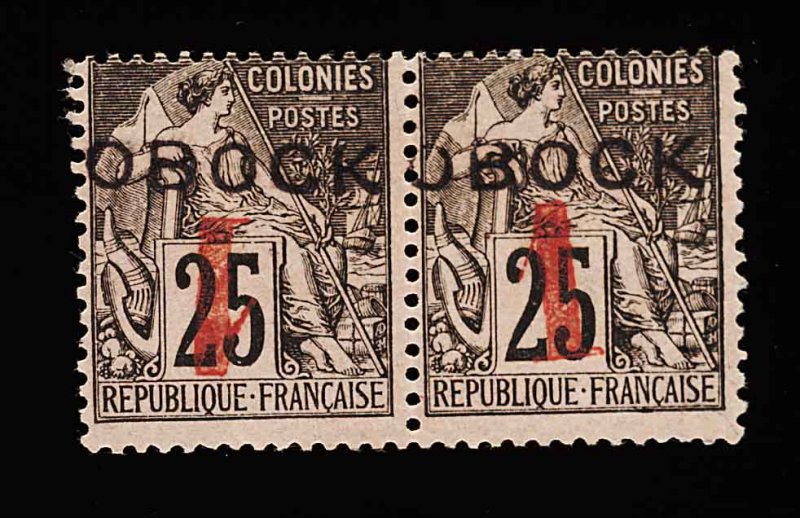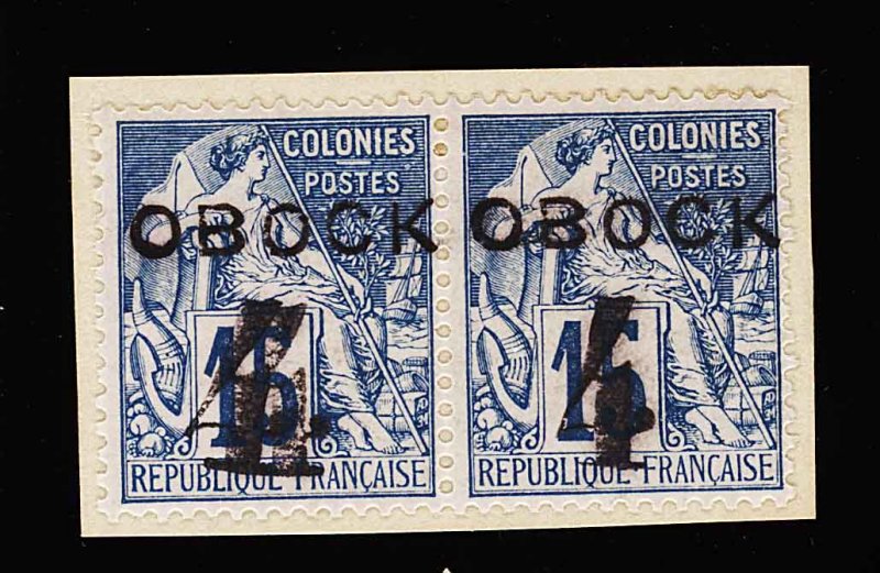 157 og 14 var./20 var. example image#14var./20var., 1892 10c, 15c, 20c, 40c and 1Fr, with "Obock" handstamp, double ovpts., each with two distinct overprints, fresh colors, o.g., fine-very fine; a scarce group of errors; 15c and 20c signed Calves; unlisted in Scott (Yvert #14a, 15a, 16a, 18a, 20a). (Example Image) Yvert 6,100FF