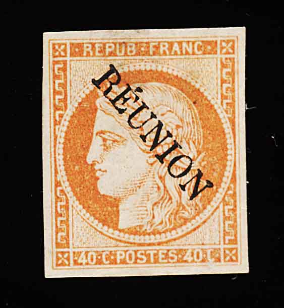 165 og 11 image#11, 1891 40c Orange on yellowish, with "Reunion" ovpt., four large even margins, brilliantly fresh color and a clean impression, o.g., h.r., very fine; signed Calves (Yvert #11; FF 3,500). (Image) 425.00