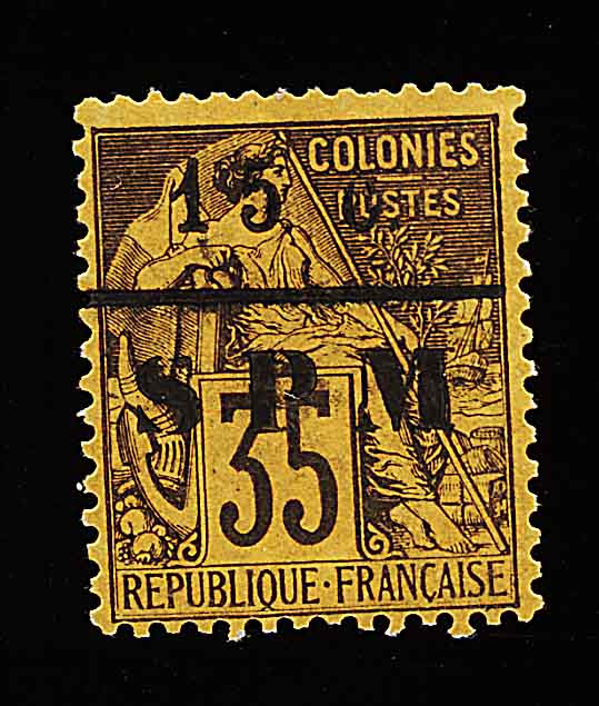 175 og 17 image#17, 1891 "15c./SPM" Small surcharge on 35c Black on orange, bright and fresh, o.g., fine; a very scarce stamp; signed A. Brun (Yvert #15; FF 11,500). (Image) 1,100.00