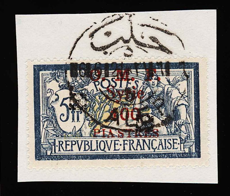 193 O 72 var. image#72 var., 1920 100P on 5Fr Dark blue and buff, with double black fleuron ovpt., tied to piece by Alep c.d.s. (stamp has been lifted for examination and hinged back in place), rich color, very fine; an immensely rare variety and especially difficult to find used; 2000 Behr certificate; unlisted in Scott (Yvert #56A var.) (Image) Yvert 25,000FF