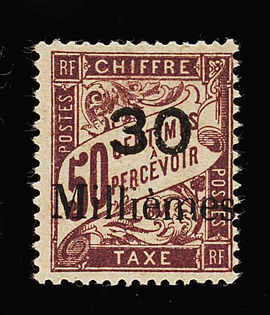 33 og J4 image#J4, 1921 "30 Milliemes" Surcharge on 50c Red violet postage due, deep color, o.g., h.r., fine; a rare stamp which is very seldom offered; signed Calves, A. Brun, Champion (Yvert #T4; FF 20,000). (Image) 2,000.00