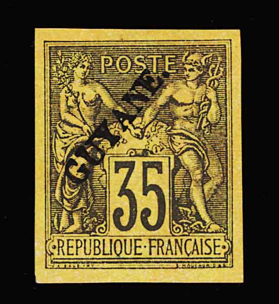 82 og 14 image#14, 1892 35c Black on orange, with "Guyane." ovpt., another example of this rare stamp, this one still retains part of its original gum which is unusual on this stamp, ample to large margins all around, strong color, very fine; signed Calves, A. Brun and Marquelet (Yvert #12; FF 16,500). (Image) 1,600.00