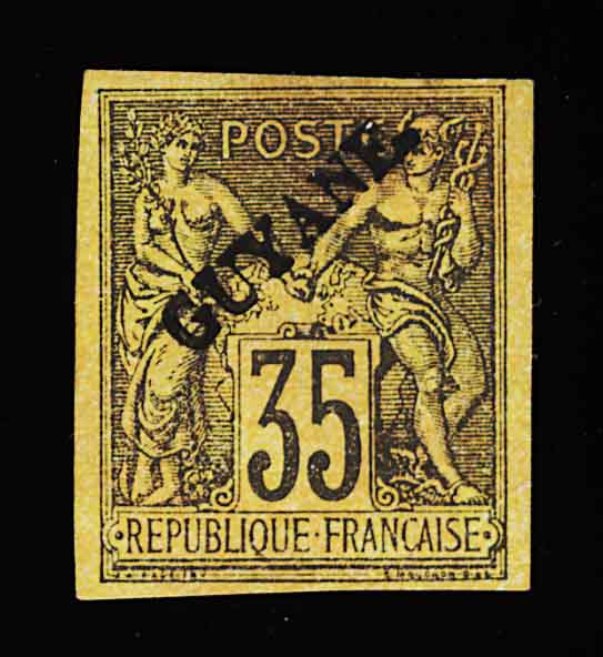 81 ng 14 image#14, 1892 35c Black on orange, with "Guyane." ovpt., an outstanding unused single, without gum as most examples exist, large even margins all around, brilliantly fresh color, extremely fine; seldom encountered with margins this uniformly large; signed A. Brun, Marquelet and accompanied by a 1998 Behr certificate (Yvert #12; FF 16,500). (Image) 1,600.00
