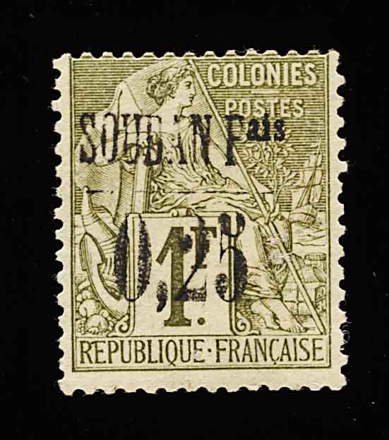 96 O 7 image#7, 1888 "15" Surcharge on 1Fr Bronze green on straw, used, with centrally struck Libreville c.d.s., a fresh and fine example of this elusive stamp; signed Calves and others (Yvert #7; FF 6,500). (Image) 850.00