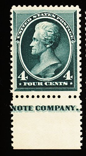 236 nh 211 image#211, 4c Blue green, handsome bottom sheet-margin partial imprint single, wonderfully fresh, with deep luxuriant color and a strong impression, well centered, o.g., never hinged, very fine and quite choice; seldom found never hinged and in premium condition; photocopy of a 1998 PF certificate for a plate block of twelve from which this stamp was taken. (Image) for hinged 250.00