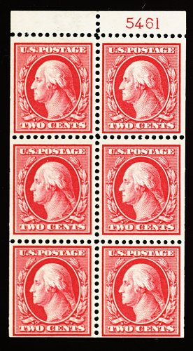 421 nhK 375a image#375a, 2c Carmine booklet pane of six, a choice example of the scarce position D showing plate no. 5461 in the selvage tab, brilliantly fresh, with strong intact perforations, intense "fiery" color and impression, well centered, pristine o.g., n.h., extremely fine; seldom encountered in this premium condition; 2000 PF certificate. (Image) 225.00