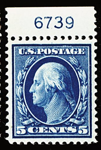 426 nh 378 image#378, 5c Blue, top sheet-margin plate no. 6739 single, perfectly centered within large margins, incredibly fresh and bright, o.g., n.h., extremely fine and quite choice; 1989 PF certificate. (Image) 55.00