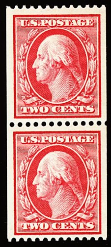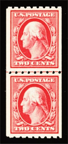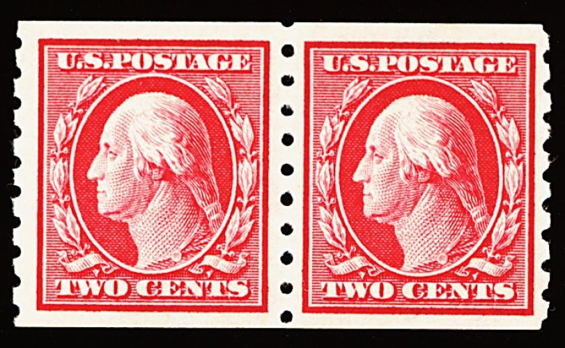 437 nh 391 image#391, 2c Carmine coil, perf. 8 1/2 horiz., a magnificent quality guide line pair, possessing outstanding centering and unusually large margins on both stamps in the pair, plus its color is a visually striking "blood" red shade and its impression razor-sharp on bright fresh paper, immaculate o.g., n.h., extremely fine; gem certified line pairs of #391 are few and far between, and when they appear on the auction market they invariably realize multiples of their catalog value; 1996 PF certificate for a line strip of six from which this pair was taken. (Image) 425.00