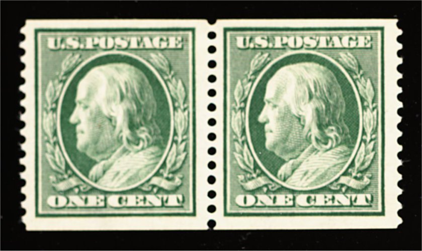 434 nh 387 image#387, 1c Green coil, perf. 12 vert., pair, 3mm spacing, quite well centered within especially large margins, brilliantly fresh, strong color, o.g., n.h., a very fine and choice mint pair of this difficult coil; 1977 PF certificate. (Image) 600.00