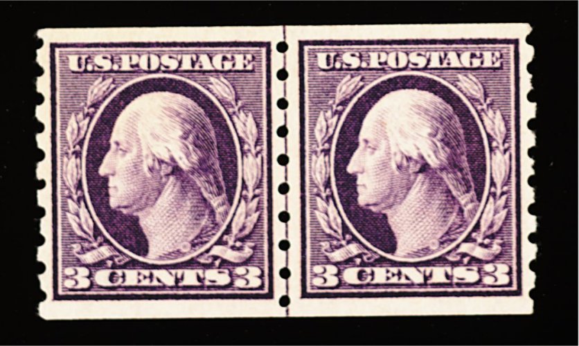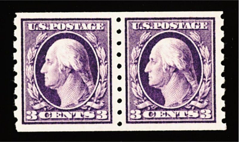 439 nh 394 image#394, 3c Deep violet coil, perf. 8 1/2 vert., pair, 2mm spacing, incredibly well centered within large well balanced margins, exceptionally fresh and crisp, deep luxuriant color, pristine o.g., n.h., extremely fine; an especially scarce coil pair in this gem quality; 1992 PF certificate. (Image) 230.00