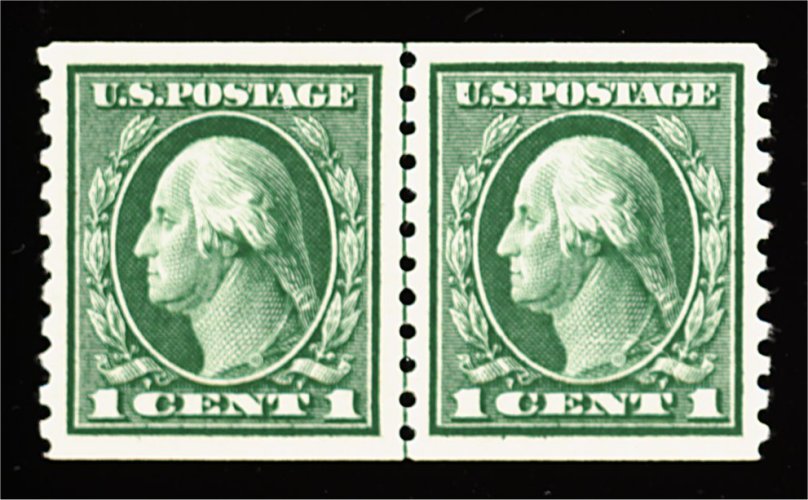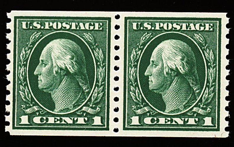 502 nh 443 image#443, 1c Green flat plate coil, perf. 10 vert., a superb guide line pair that is virtual perfection in its overall quality, possessing mathematically precise centering amid extravagantly large margins all around. striking color and impression that would rival any proof, all on brilliantly fresh paper, o.g., n.h., extremely fine; a highly desirable line pair in this gem condition; 1991 and 2001 PF certificates. (Image) 240.00