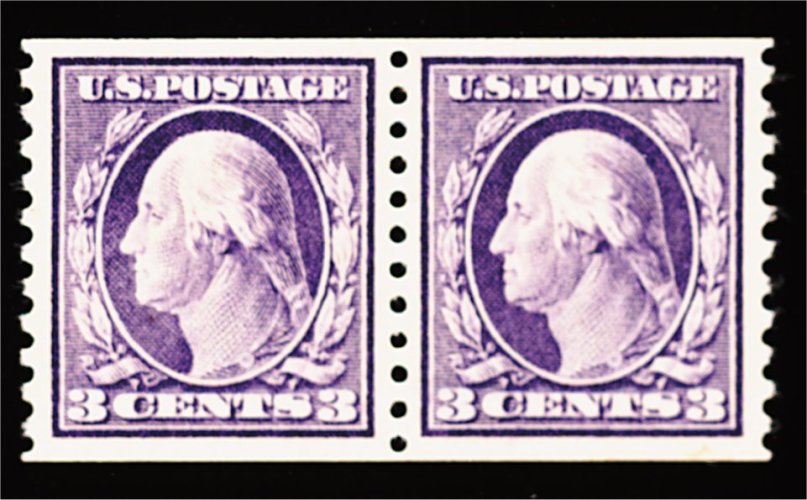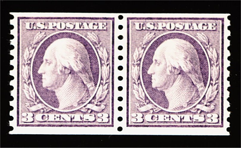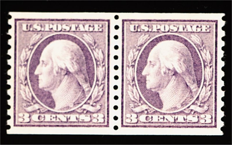 503 og 445 image#445, 3c Violet flat plate coil, perf. 10 vert., a gem quality mint pair of this scarce coil, possessing absolutely perfect centering amid uncharacteristically large margins, strong rich color and a crisp impression on immaculate paper, o.g., lightly hinged, extremely fine; an especially desirable coil pair; 1976 PF certificate. (Image) 550.00