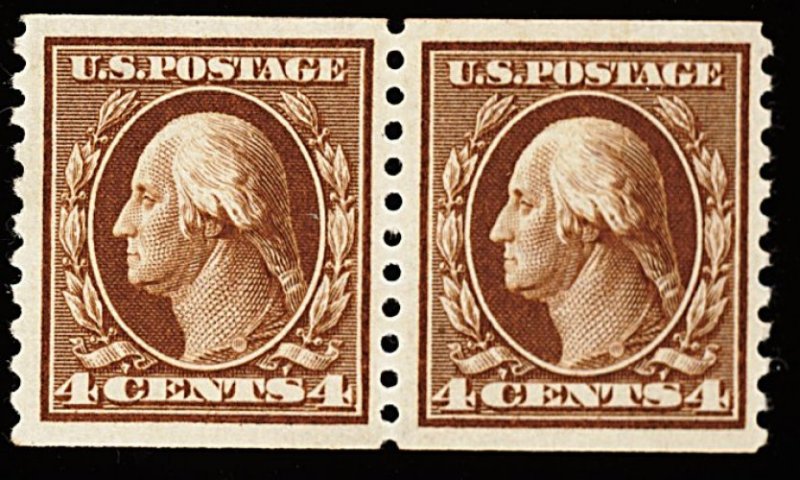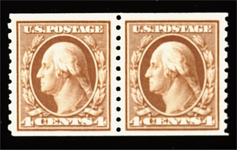 505 nh 446 image#446, 4c Brown flat plate coil, perf. 10 vert., pristine mint pair, possessing an exceptional overall freshness, with prooflike color and impression, wonderfully well centered as well, with large margins all around, o.g., n.h., extremely fine; an especially elusive coil pair in this choice never hinged condition; 1991 PF certificate. (Image) 525.00