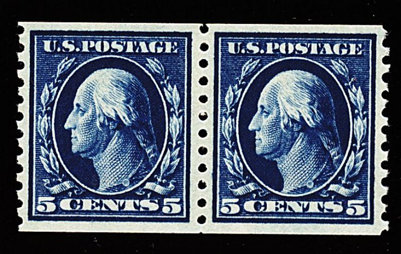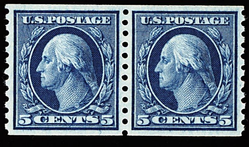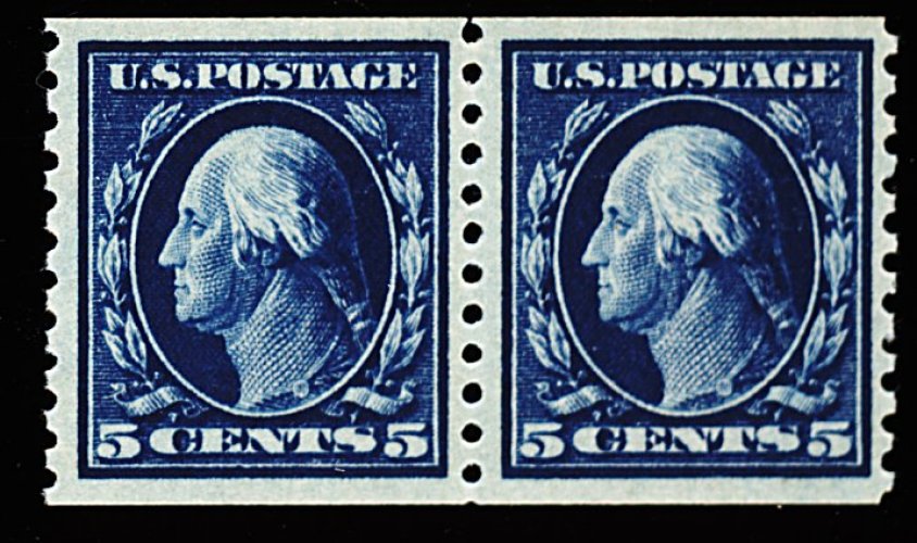 508 nh 447 image#447, 5c Blue flat plate coil, perf. 10 vert., an exceptionally fresh mint pair, deep luxuriant color, extraordinarily well centered, pristine o.g., n.h., extremely fine and quite handsome; 1989 PSE certificate. (Image) 190.00