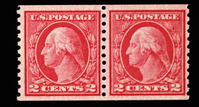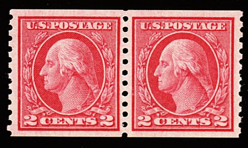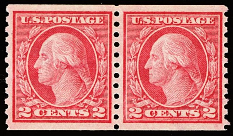 514 nh 454 image#454, 2c Red rotary coil, Ty. II, perf. 10 vert., brilliant "post office" fresh mint pair, possessing radiant color and a deeply etched impression, flawlessly centered, o.g., n.h., extremely fine; a particularly choice coil pair; 1989 PF certificate for a strip of five from which this pair was taken. (Image) 300.00