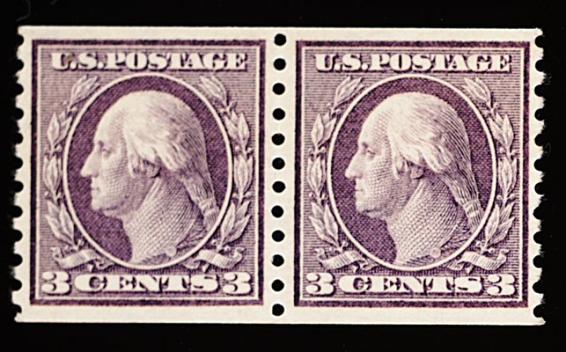 516 nh 456 image#456, 3c Violet rotary coil, Ty. I, perf. 10 vert., a magnificent quality mint pair, possessing virtually perfect centering and each stamp is lavishly margined all around (a rare occurrence on this), plus this pair boasts an unusual overall brilliance and crispness few others enjoy, strong color and impression on immaculate paper, pristine o.g., n.h., extremely fine; a gem example of this very scarce coil pair; 2001 PF certificate. (Image) 975.00