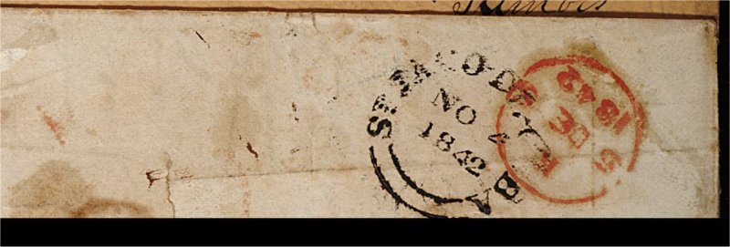 784 c imageBritish Post Office, "St. Iago de Cuba" double arc origin d.s. on reverse of 1842 (Nov. 4) entire letter to Rouen, France (Dec. 7) via St. Thomas on the Tweed to Bermuda on the Solway for Falmouth and then London (Dec. 5), showing framed "Packet Letter" h.s. in red, rated "3 / 2" (credit for British including 10 pence to France) and "56" decimes (collected from addressee including 1 franc transit from England and 8 decimes internal postage), soiled, nevertheless a most interesting example of trans-Atlantic routing and rating. (Image) Est. 100-150