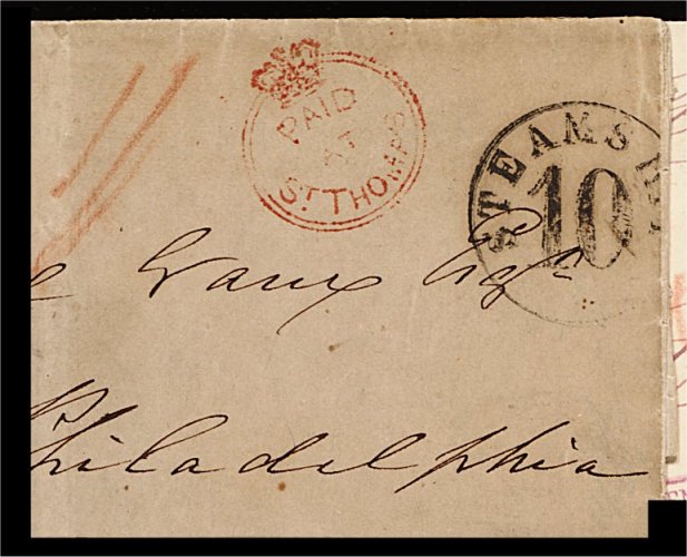 787 c imagePaid / at / St. Thomas Crowned circle double-ring h.s. in red, a very fine strike on 1852 (Jan. 20) entire letter to Philadelphia, St. Thomas origin double arc d.s. on reverse and circular "Steamship 10" h.s. on front, toned as is usual from this correspondence and splitting at folds. (Image) Est. 200-300