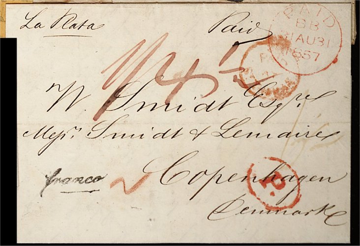 788 c imagePaid / at / St. Thomas Crowned circle double-ring h.s. in red, clearly legible strike, on 1857 (Aug. 14) entire letter to Copenhagen via London, with transit d.s. of German and Danish Post Offices at Hamburg and unframed "franco", also shows oval "P." h.s. in red, rated "1 / 4 1/2" and endorsed "La Plata", a fresh and very fine cover. (Image) Est. 200-300