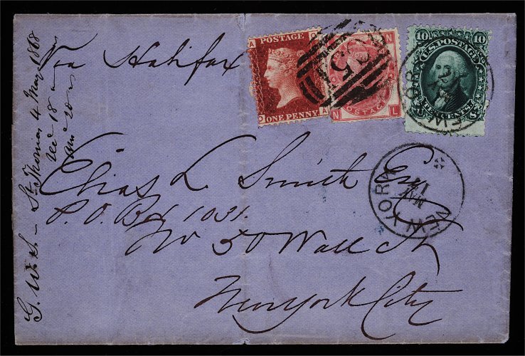 789 c 33,44 imageGreat Britain #33, 44, 1863-64 1p Rose red plate 71 and 3p rose plate 4, cancelled "C51" in combination with U.S.A. 1861-62 10c blue green (#68b) cancelled by "New York" arrival c.d.s. which also ties the 3p stamp, on 1868 (May 4) entire letter (tiny tear at top from filing crease) from St. Thomas to New York "via Halifax", with origin c.d.s. on reverse, fine; a splendid cover carried by British packet depicting prepayment of postage to Halifax and New York with postage stamps of the two respective countries. (Image) Est. 2,000-3,000