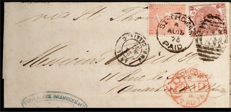 790 c 43, 53 imageGreat Britain #43, 53, 4p Vermilion plate 14 and 10p Red brown plate 1 on 1875 entire from Para, Brazil to Paris via London, both tied by neat "St. Thomas / Paid / C51" duplex, backstamped on arrival, filing crease and splitting at folds have been professionally reinforced, overall a very fine and handsome cover. (Image) Est. 300-400