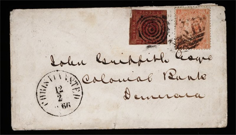791 c 1 image#1, 1856 3c Dark carmine (brown gum), large to full margins on three sides, just touched at top, on neat 1866 (Feb. 12) Colonial Bank envelope (minor faults as to be expected), from St. Croix to Demerara, British Guiana, cancelled by mute type target, showing "Christiansted" origin c.d.s. adjacent, and in combination with Great Britain 1865 4p pale vermilion plate 7 (#43a), trivial corner creasing, cancelled "C51", showing matching St. Thomas British P.O. d.s. as well as arrival c.d.s. on reverse, an exceedingly rare combination cover, of which less than ten DWI-British frankings are recorded. (Image) Est. 3,000-4,000