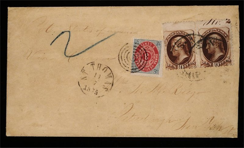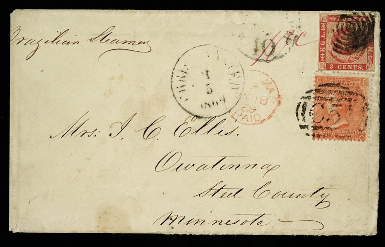 792 c 2 image#2, 1866 3c Rose, full margins on three sides, touched at right, on 1869 (May 7) envelope (a trifle reduced at left) from St. Croix to Minnesota by "Brazilian Steamer", cancelled by mute type target and showing "Christiansted" origin c.d.s. adjacent, used in combination with Great Britain 1865 4p vermilion plate 10 (#43), small defect in margin at top, cancelled "C51" with "St. Thomas / Paid" c.d.s. in red alongside, manuscript "10c." for cash payment of U.S. stamp to prepay Brazilian packet line postage and U.S. internal postage; however, the Brazilian ship "Mississippi" failed to arrive on account of being shipwrecked off the coast of Martinique, hence the use of the 4p stamp to pay for the British packet to Havana, with circular "Steamship 10" h.s. indicating postage due for packet to New York and the inland American postage; an extraordinary combination cover only partially prepaid to destination with postage due charged. (Image) Est. 5,000-7,500